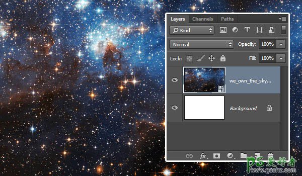 1、创建950*550像素画布,将星空素材置入到背景图层上方,然后按画布大小调整尺寸。