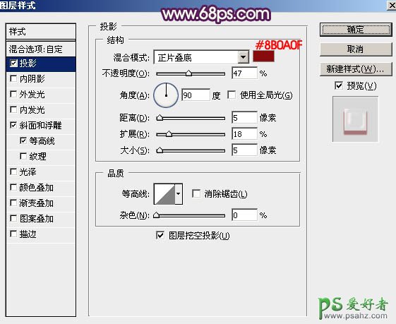 7、双击当前图层缩略图区域载入图层样式。 投影:混合模式“正片叠底”,颜色为暗红色:#880a0f,其它设置如下图。