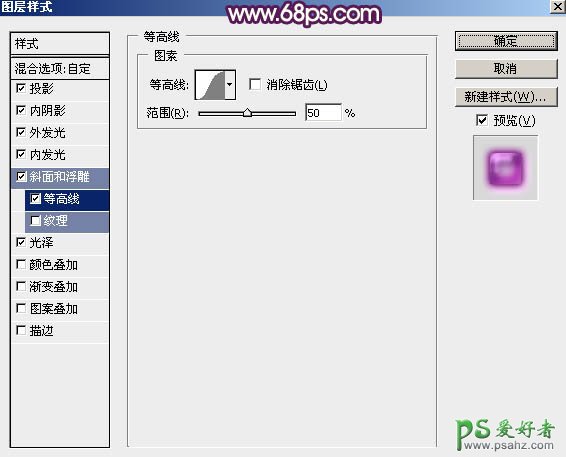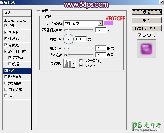 光泽:混合模式“正片叠底”,颜色为紫色:#e07cee,其它设置如下图。