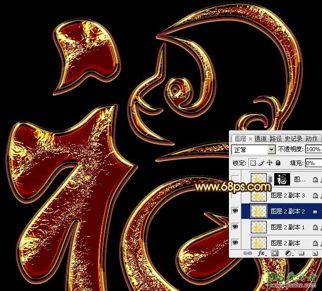PS金属立体字制作教程:设计金黄色华丽效果的三维立体铬金福字,教程重点是表面字部分的制作,用到了多个文字图层及多组图层样式;每一个图层增加不同的效果,叠加到一起实现最终的字效,这种字我们在设计节日海报,宣传化的时候常用得到,喜欢的朋友们好好