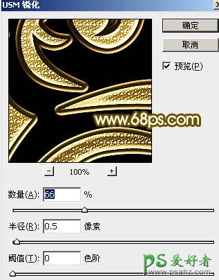 23、选择菜单:滤镜 > 锐化 > USM锐化,参数设置如图37。