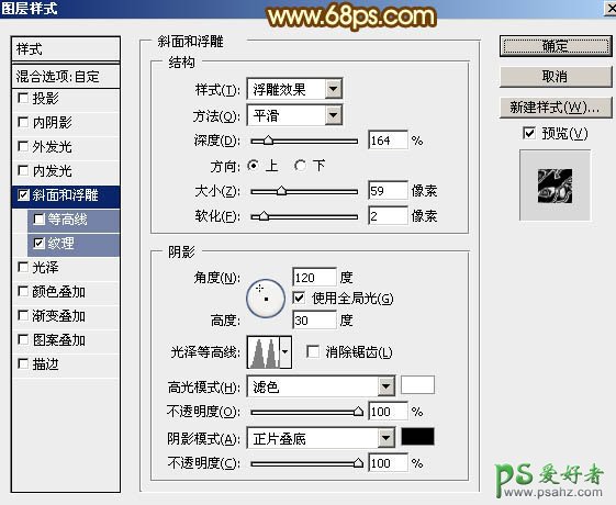 2、双击图层面板,当前图层缩略图载入图层样式,然后设置。 斜面和浮雕:样式选择“浮雕效果”,方法“平滑”,其它设置如下图。