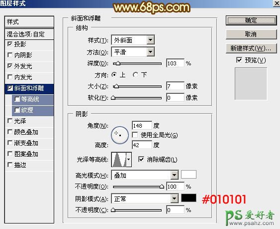 斜面和浮雕:样式为“外斜面”,其它设置如下图。