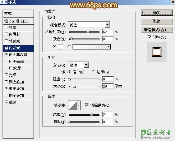 5、给当前图层重新设置图层样式。 内发光:混合模式“滤色”,适当增加杂色,其它设置如下图。