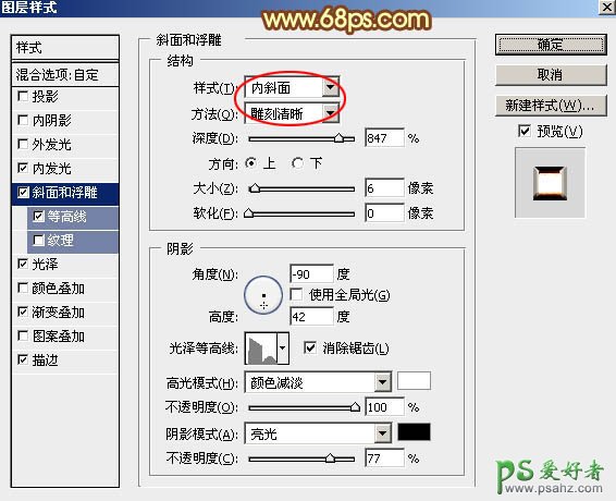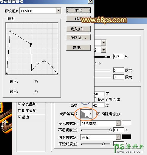 斜面和浮雕:样式“内斜面”,方法“雕刻清晰”,其它设置如图8,然后点击光泽等高线曲线缩略图编辑曲线,设置如图9。