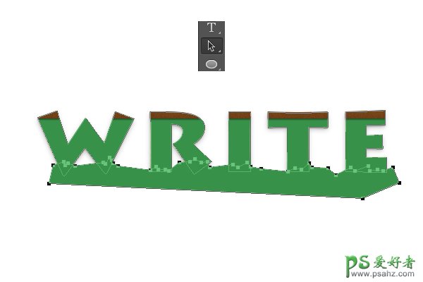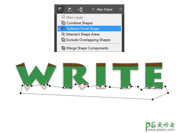现在我们来运用路径选择工具,在绿色字上选择我们刚用钢笔工具画好的形状,然后选择减去顶层图层~制作出底边撕碎纸张的效果哦~