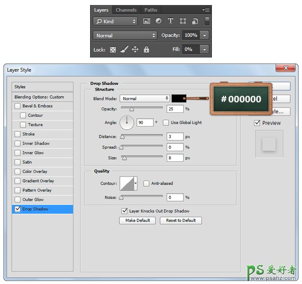 投影,正常,透明度25%,角度90°,距离3px,大小8px