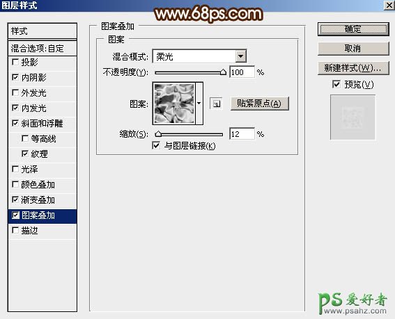 图案叠加:混合模式“柔光”,其它设置如下图。