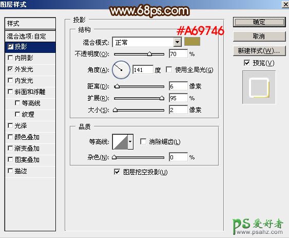 2、双击图层面板,当前文字图层缩略图载入图层样式,然后设置。 投影:颜色为黄褐色:#a69746,其它设置如下图。