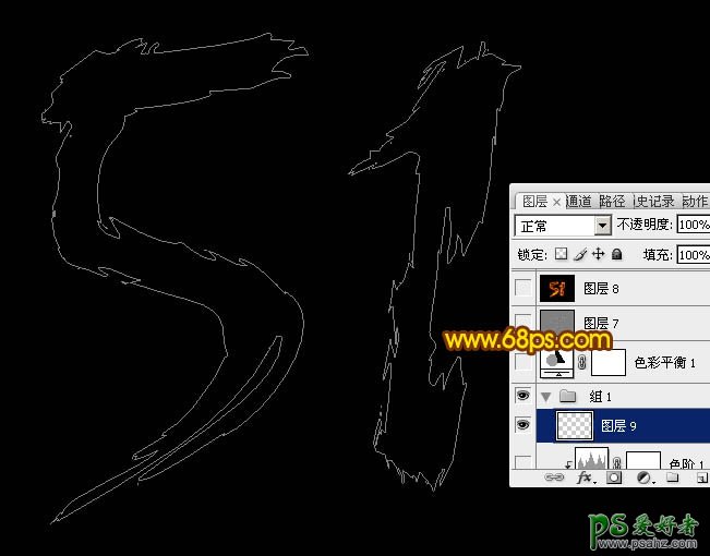 6、把文字图层隐藏。在背景图层上面新建一个组,得到组1,在组里新建一个图层,路径不要取消。