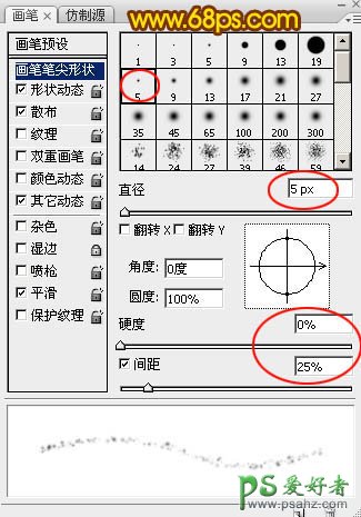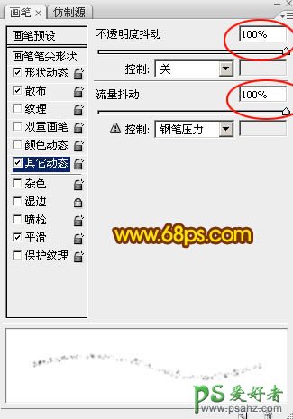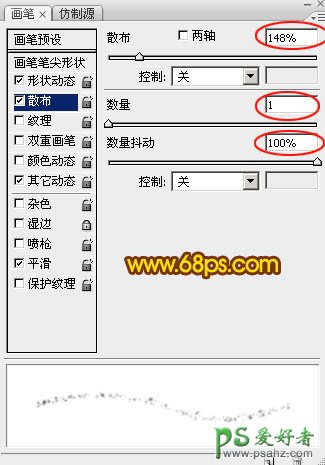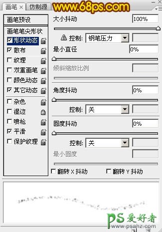 7、选择画笔工具,选择一款柔边圆形画笔,再按F5调出画笔预设面板,设置:画笔笔尖形状,形状动态,散布,其它动态。同时勾选平滑选项。参数设置如图8 - 11。