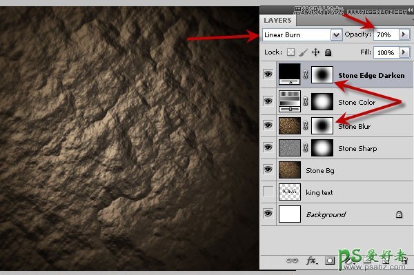 26、把图层命名为“Stone Edge Darken”,同上的方法复制“Stone Blur”图层蒙版。再把混合模式改为“线性加深”,不透明度改为70%,如下图。