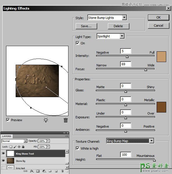 27、新建一个图层,填充白色。选择菜单:滤镜 > 渲染 > 光照效果,样式选择之前保存的设置,只是纹理通道要选择“King Bump Map”,如下图。