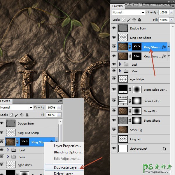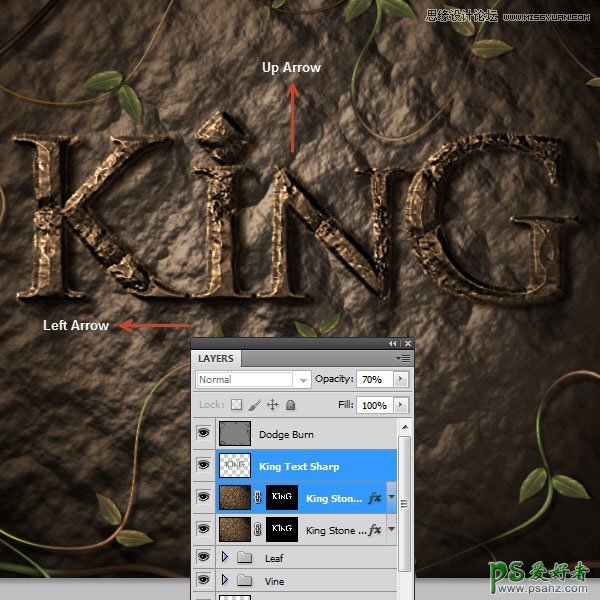 68、把“King Stone Text”图层复制一层,然后把副本和“King Text Sharp”图层选中,往左上移动一下。