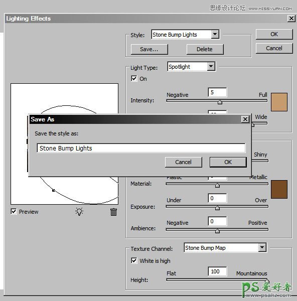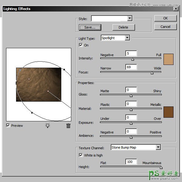 14、回到图层面板,把“Stone Bg”显示出来,然后选择菜单:滤镜 > 渲染 > 光照效果,纹理通道选择“Stone Bump Map”通道,如下图。