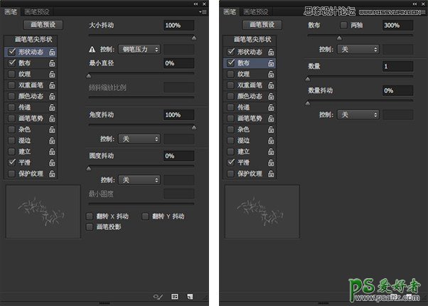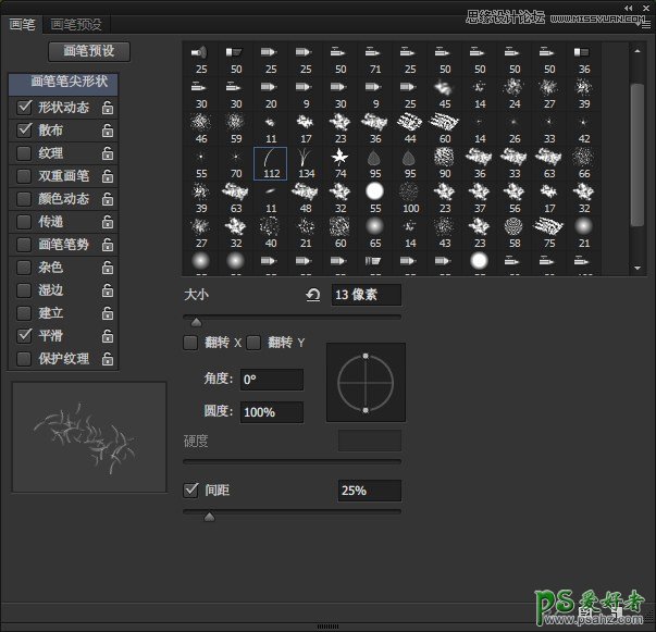 形状现在是有了,接下来我们来为它填充纹理,在这里需要的就是调整画笔工具,首先选择画笔工具,然后按F5打开画笔调整工具,按照下图进行调整。