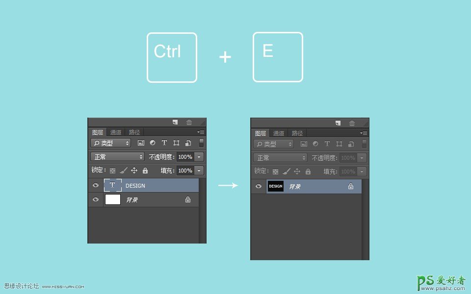 这时,选中文字层与背景层,使用快捷组合键“Ctrl+E”合并这两个图层。