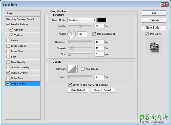 投影效果:参数如图:不透明度50%,距离10像素,扩展15%,大小5像素。
