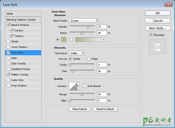 内发光设置:杂色:49%,颜色:#b3b694,图素:居中,大小:16像素。