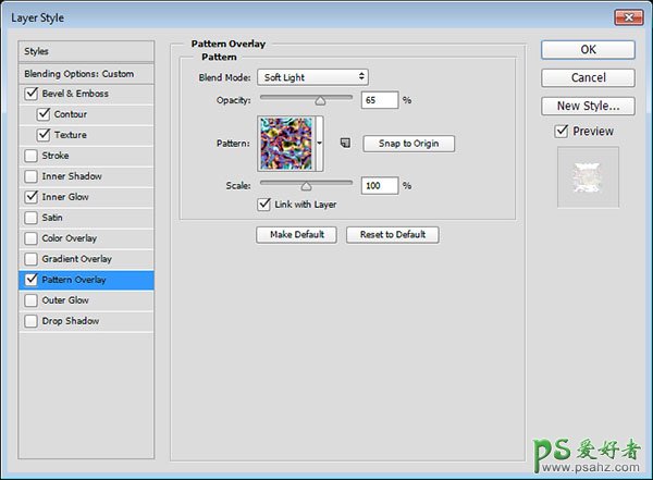 图案叠加:混合模式:柔光,不透明度:65%,图案:Nebula。