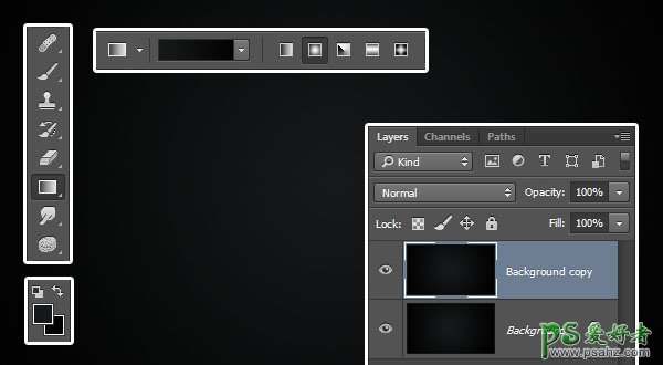 1、新建文件,大小:1342 X 755像素。前景色:#161819 背景色:#010101。使用渐变工具,选择径向渐变,从图像中间拉到边角,再复制背景层。