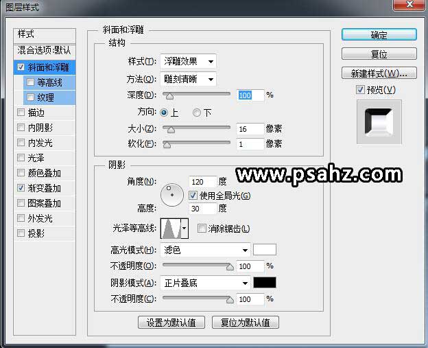 2、点击图层—图层样式—斜面和浮雕 设置如下。