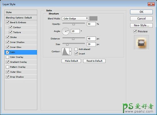 混合模式:颜色减淡,颜色:#9a9a9a,距离:48像素,大小:39像素,等高线:锥形-非对称。