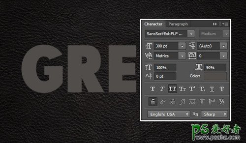 第1步:新建文字图层,使用字体:SansSerif Exb FLF(在01压缩包里放着),输入全大写字母:GREAT,大小:300像素,颜色:#504d4a,水平缩放比例:90%。详细参数设置见下图。