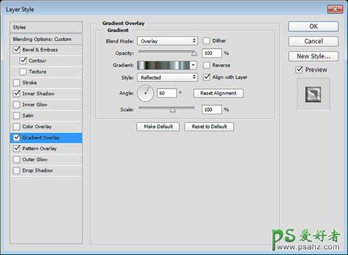 混合模式:叠加,样式:对称的,角度:60度,使用faucet30渐变填充(在05压缩包里放着,名为:CHROMES的渐变文件中可以找到名为faucet30的渐变)。