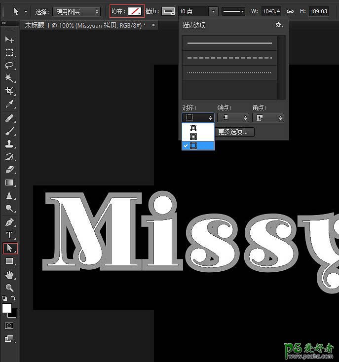 4、复制文本形状图层,用直接选择工具选项栏的形状设置。 改变成没有填充,描边颜色灰色,描边大小10,对齐到外面。