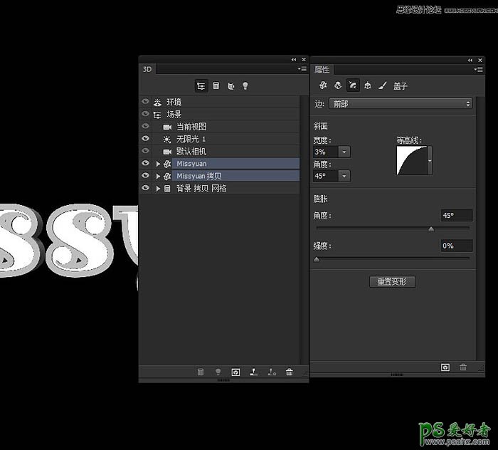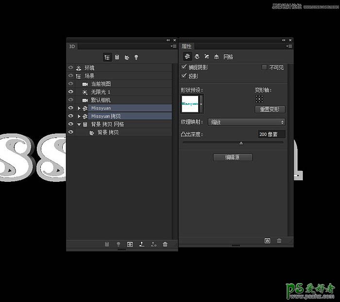 8、打开3D面板和属性面板,(窗口菜单下找到)。在3D面板选择文本形状网格名称标签(选择一个然后Ctrl/Cmd +选择其他),改变挤压深度值在属性面板数值自定。