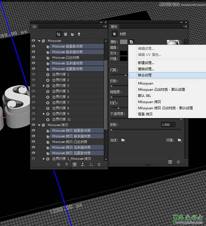 13、首先在3D网格面板选择所有文本材质标签的组件除了凸出材质,(Ctrl / Cmd +点击选项卡选择)。 然后,在属性面板中,单击漫射纹理图标并选择移除纹理。