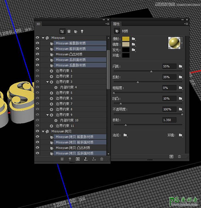 14、创建一个闪亮的黄金材料。改变漫射颜色#bea221,镜像#bbb08c,闪亮55%,反射35%,折射到1.35。