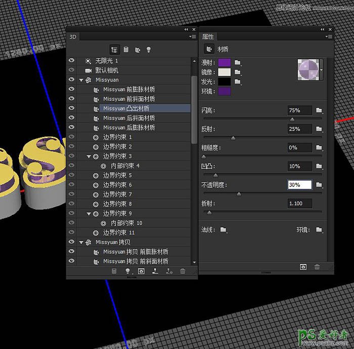 15、创建的玻璃材料。选择文本内部凸出材质标签,删除漫反射纹理,然后改变漫射颜色#6c1e98,镜像#e3e1d7,环境#4d1972,闪亮75%,反射到25%,透明度为30%,折射到1.1。