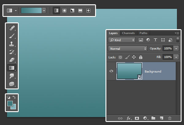 创建一个 770 x 490px 新文档。设置前景色为 #3f797d,背景色为 #80b2bb。选择渐变工具,在选项栏里点击线性渐变图标。然后从文档的底部到其顶部进行拖动以创建渐变背景。