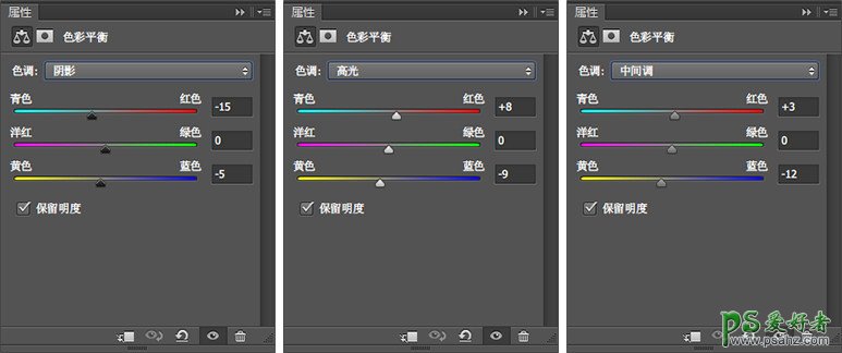 通过后期调色可以使颜色更加绚丽,更加饱满,在这里我们使用色彩平衡工具进行调节,参考数值如下。