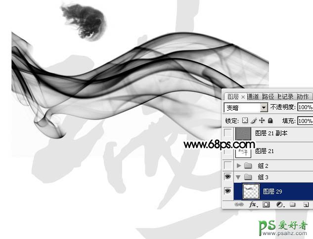 12、打开第二副烟雾素材,拖进来,调整好大小,把混合模式改为“变暗”,如下图。