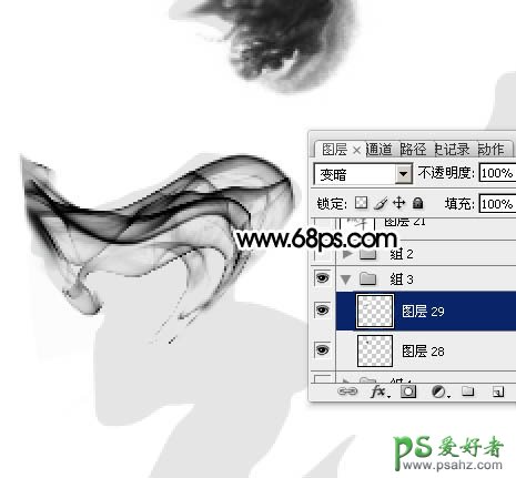 17、同上的方法添加更多的烟雾素材,直到把文字的笔画都填满,过程如图18 - 21。