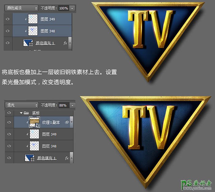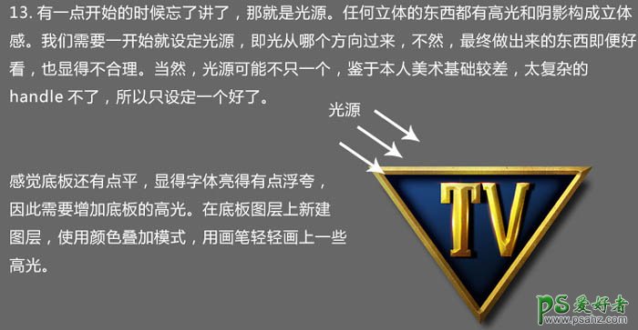 13、感觉底板还是有点平,显得字体亮得有点浮夸,因此需要增加底部的高光。在底板图层上新建图层,使用颜色叠加模式,用画笔轻轻画上一些高光。