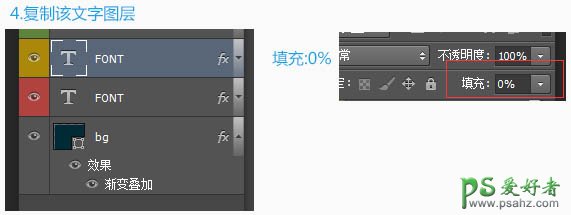 4、复制该文字图层,把副本填充改为:0%,然后清除图层样式,再重新设置。