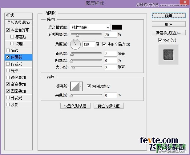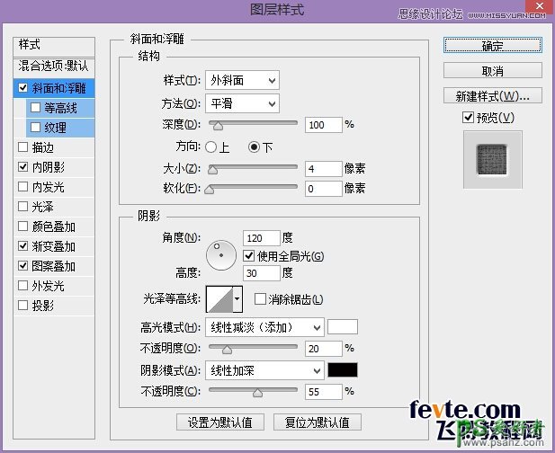 对标题文本应用下列图层样式,"图案叠加"中的图案所用的是Photoshop图案库中"艺术表面"的"厚织物"图案。