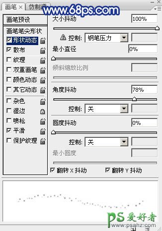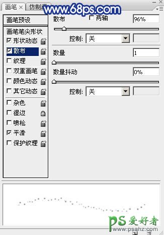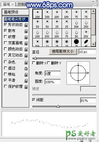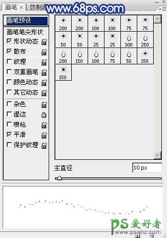 7、返回图层面板,选择画笔工具,选择刚才载入的星光笔刷,再按F5调出画笔预设面板,设置:画笔预设、画笔笔尖形状、形状动态、散布,参数设置如图10 - 13。