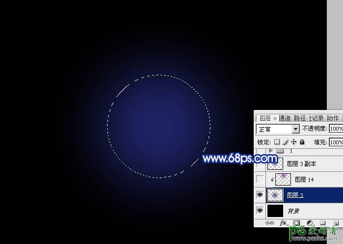1、新建一个1000 * 750像素,分辨率为72的画布,背景填充黑色。新建一个图层,用椭圆选框工具拉出下图所示的选区,羽化80个像素后填充深蓝色:#22266F,取消选区后如下图。