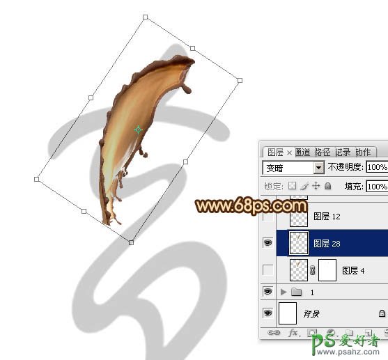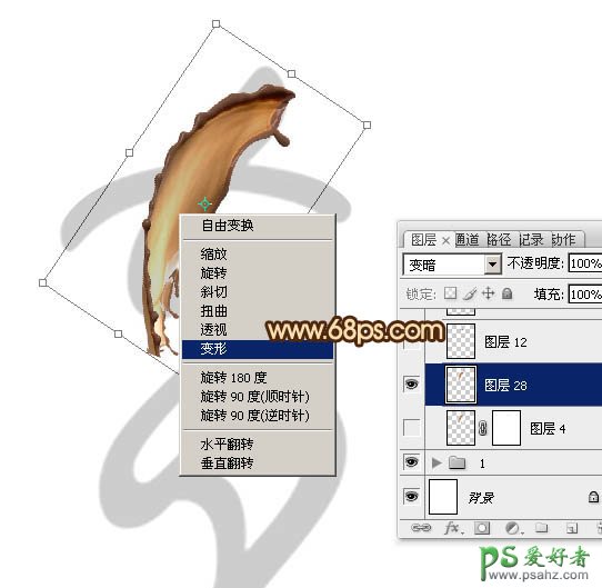 6、按Ctrl + T 变形,把喷溅素材移到文字上面,再调整角度和大小,如下图。调完后不要确定。