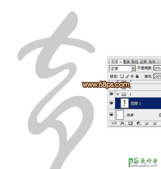 1、打开文字素材(点击小图弹出大图,然后右键保存到本机),用PS打开保持的文字图片,按Ctrl + J 复制一层,背景填充白色,再把文字副本图层不透明度改为:20%,如下图。 这里的文字仅作为参考,后面我们会用喷溅素材按照文字笔画作变形处理。