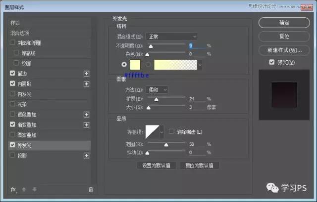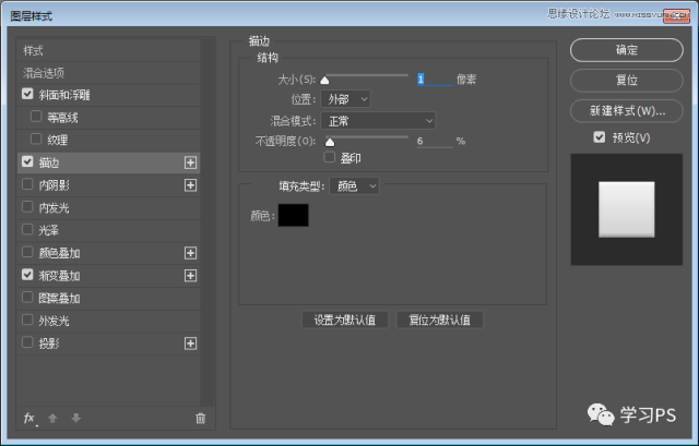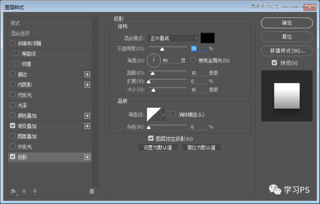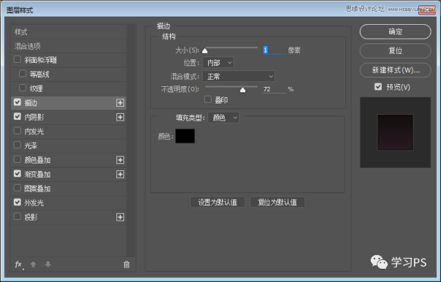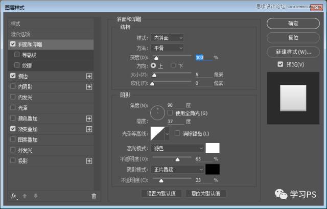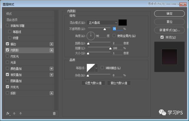 使用圆角矩形、绘制一个280*280,圆角半径为50px的图层,并为它添加图层样式。