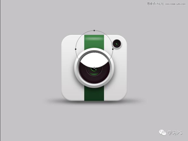 现在使用形状工具布尔运算为镜头添加高光吧、绘制两个正圆相交命令下留取高光形状,颜色为白色。