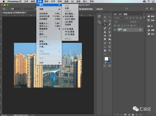 1.首先打开你想要工作的照片。在开始之前,我们需要检查一下:照片应该是RGB颜色模式和8位/通道 。 要检查,请转到图像>模式。照片应该是背景图层。