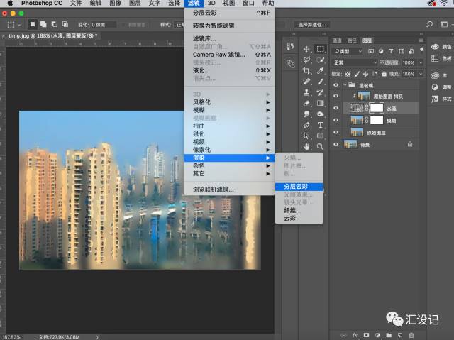 12.转到“ 图层”面板 ,创建“ 水滴”的图层蒙版。按键盘上的D可重新选择色板。转到滤镜>渲染>分层云彩 。