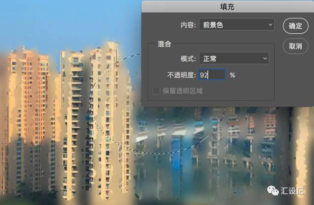 16.选择水滴层的层蒙版 。按键盘上的D可重设色板( 确保前景色为白色)。转到编辑>填充 ,然后选择内容,前景颜色和不透明度92% 。然后单击确定 。